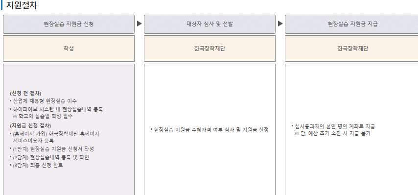 | ■ 현장실습 지원금 ■ 현장실습 지원금 신청 기간, 신청방법 ■ 현장실습 지원금 지급대상 |
