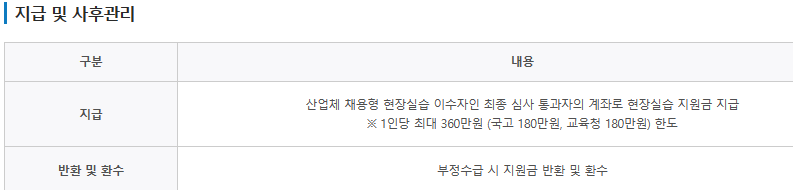 현장실습 지원금은 실무교육을 수료한 뒤 학교에서 최종 확정한 실습일자를 기준으로 지원을 합니다.
