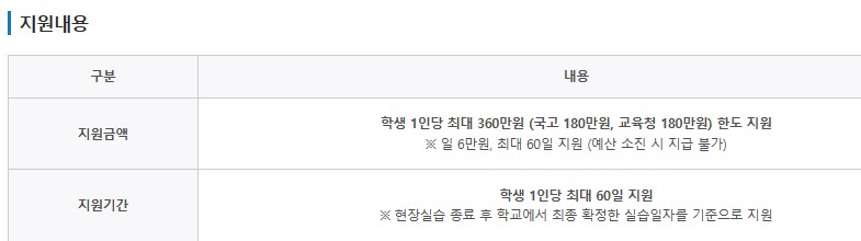 현장실습 지원금은 고등학교 3학년 학생이 산업체의 채용형 현장실습에 참여한 학생을 대상으로 현장실습 1일당 6만원을 지원해주는 정책입니다. 예산이 소진되면 지급이 불가하고, 360만원 내에서 최대 60일까지 지원이 됩니다.