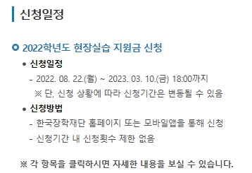 현장실습 지원금 신청 기간은 예산에 따라 변동될수 있는데2022년 8월 22일부터 2023년 3월10일 오후 6시까지 입니다. 2023년 졸업일 이전까지 완료된 현장실습만 기간에 인정이 되고, 60일을 넘기더라도 60일까지만 지원이 됩니다.