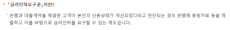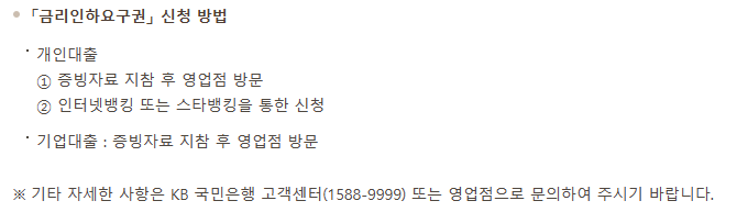 | ■ 국민은행 금리인하 요구권 ■ 국민은행 금리인하 요구권 지원대상 ■ 국민은행 금리인하 요구권 신청방법 ■ 국민은행 금리인하 요구권 서류 |