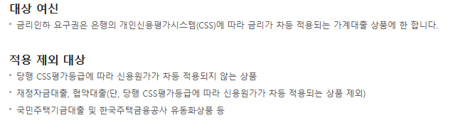 주택담보대출, 전세자금대출, 신용대출도 해당되지만 대출을 받은 상품이 신용 상태별로 금리가 차등이 있는 상품만 가능합니다.