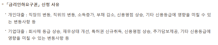 신용등급 상승, 연소득 변동, 승진등으로 소득과 자산이 증가하거나 자영업자 및 기업의 매출액, 순이익 증가등의 조건이 있습니다. 금융사별로 이러한 조건이 다르기 때문에 본인이 이용하고 있는 금융사와 상품이 조건에 해당되는지 미리 확인하시는 것이 좋습니다.