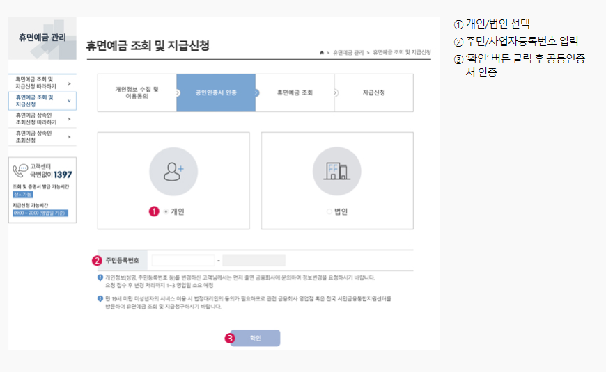 개인/법인을 선택한 뒤 주민등록번호와 사업자등록번호를 입력하시고 확인버튼을 누른 후 공동인증서로 인증을 합니다. 그러면 잊고 있던 자신의 휴면예금 찾기가 나오고 개설은행과 계좌내역들이 나오게 됩니다. 단 서민금융진흥원 휴면예금 찾아줌은 모든 것을 확인할 수 있는 것이 아니고 서민금융진흥원에 등록된 1천만원 이하 휴면예금 찾기 계좌의 잔액만 확인이 가능합니다.