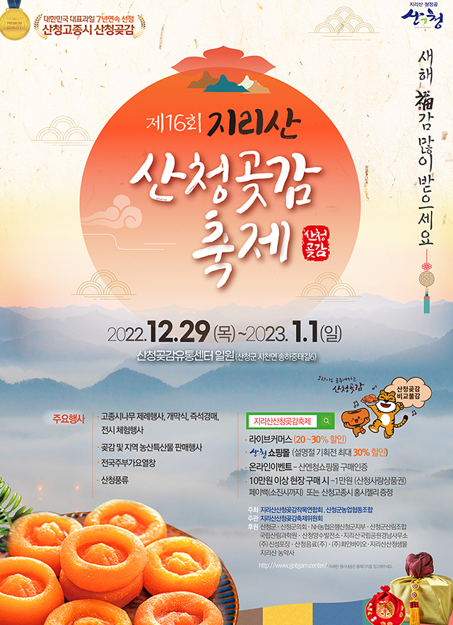 지리산 산청 곶감축제는 2022년 12월 29일 목요일 ~ 2023년 1월 1일 일요일까지 총 4일 간 진행이 됩니다. 축제 시간은 오전 10시 ~ 오후 17시 까지이고, 고종시 나무제례행사 곶감 및 지역 농수산물 판매, 전국주부가요열창, 산청풍류등의 행사가 있습니다.