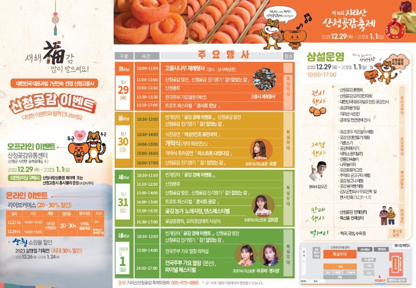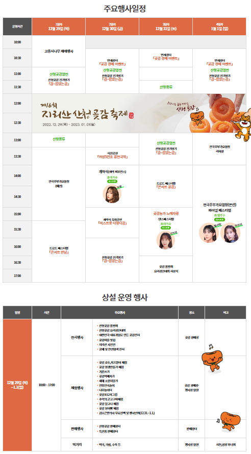 열거한 행사 외에 지리산 산정 곶감축제 일정에 다른 전시, 체험, 판매 행사들과 먹거리도 있으니 일정표를 확인하시기 바랍니다.