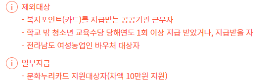 하지만 학교 밖 청소년 교육수당을 당해연도 1회 이상 지급을 받써 거나 지급받을 자, 복지포인트를 지급받고 있는 공공기관 근무자, 전남 여성 농업인 바우처 대상자는 전남 청년 문화복지카드를 지원받을 수 있는 대상에서 제외된다고 합니다. 또한 문화 누리 카드 지원대상자는 문화 누리 카드에서 지원받는 10만원을 제하고 차액 10만원만 지원이 가능합니다.